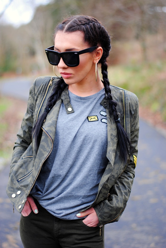 Na początku bardzo chciałam Wam podziękować za wysokie statystyki ostatniego postu, zauważyłam że ostatnio jest was wszędzie coraz więcej, co bardzo mnie cieszy :) Jak zwykle wracam do was z kolejnym modowym postem, dziś postawiłam na kolor khaki. Wiele z Was pewnie wie że od pewnego czasu jest to mój ulubiony kolor (oprócz czerni :) i większość ciuchów które ostatnio kupuję są własnie w tym kolorze. Jakiś czas temu szukając kurtki która będzie idealna na wiosnę, znalazłam tą, dlatego że w szafie nie posiadam jeszcze żadnego okrycia wierzchniego z printem moro. Połączyłam ją z oliwkowymi rurkami z nogawkami 7/8, szarym t-shirtem z efektownymi naszywkami i zamszowymi botkami. Cały look dopełniłam dobieranymi warkoczami i dużymi kolczykami.